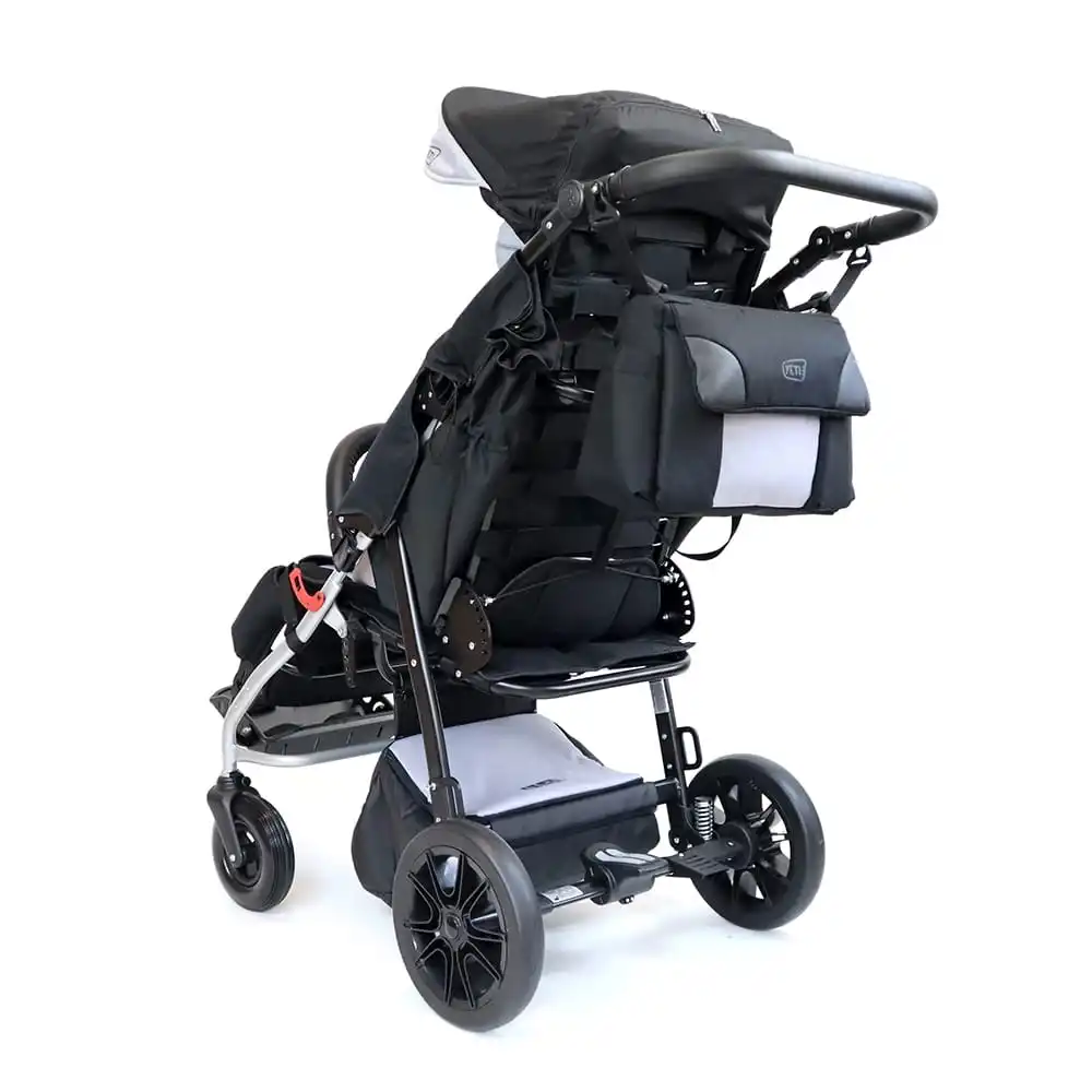 Yeti engelli çocuk puseti, hem oturma derinliği (45 cm'ye kadar uzatma) hem de sırtlık yüksekliği (85 cm'ye kadar uzatma) açısından kolayca değiştirilebilir.